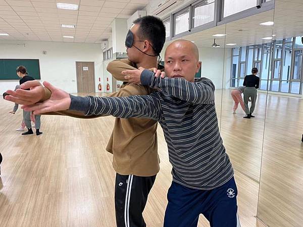 1、分二至三組(視人數調整),區分為帶領組與被引導組,被帶領組們全程矇著眼睛,隨著帶領組的口令引導與部分的身體接觸完成一套暖身,然後交換,進階發展共身、共生的身體練習。