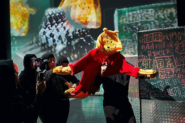 印象深刻的是在後段,數名舞者撐起一件印有小熊維尼的長睡衣,柔軟的衣服隨著操作而扭曲變形,搭配影像中戰車的畫面,儼然是一件笑裡藏刀的萌獨裁者;然後眾人陸續進入作戰狀態,其中一名站在動態捕捉區的女舞者以一種定格動畫的狀態,不斷地被擊中、倒下、爬起、被擊中、倒下、爬起循環著,最後眾人皆倒臥,然後被一片片不知名的紙片包覆丟棄…。