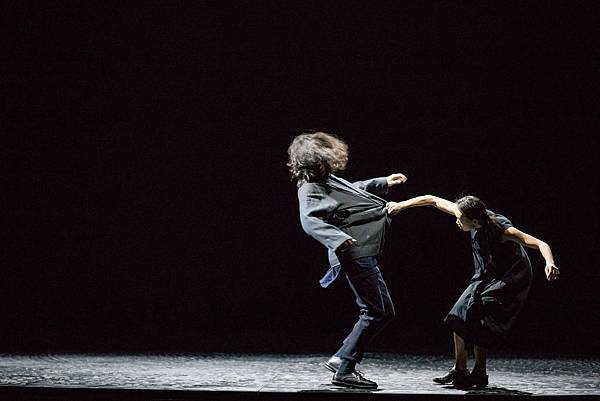 我以為那是下雨的聲音,原來是旋轉舞台在運轉時所發出的聲響,我是後來才得知這資訊的。那如粗顆粒般的沙沙聲響,有如紊亂的大小雨滴,卻又穩穩的落著;緊接進來的拉威爾《悼念公主的帕凡舞曲》,從獨奏版到變奏版,似溫柔時狂亂,聽似不同屬性的聲音類型,當它們貼合且交織時,卻又可以感受到那密不可分的關係,而這二種聲音的融合,影響了我觀賞這整場舞作的感受,我好喜歡這樣聲音的表現喔。